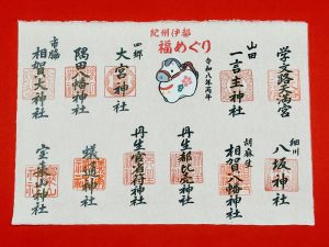 いずれかの参加神社で和紙の福めぐり台紙(台紙料1200円+ご朱印料500円)を受け、そこに各社の福めぐりご朱印(500円)を頂いていきます。