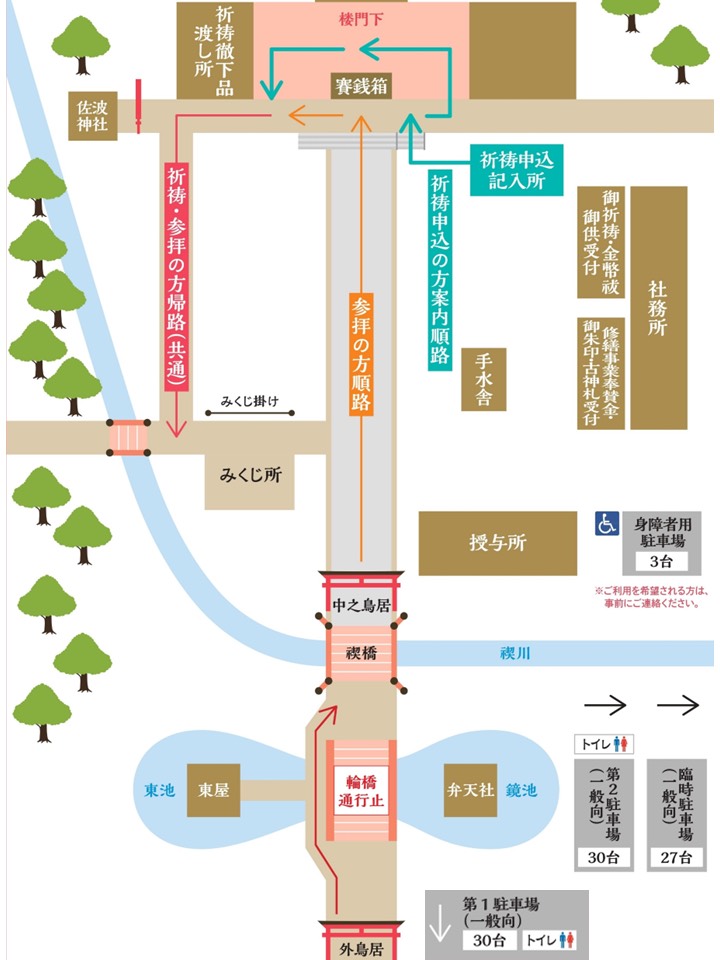〇境内にはトイレはございませんので、第1・第2駐車場内のトイレをお使いの上、ご参拝下さい。